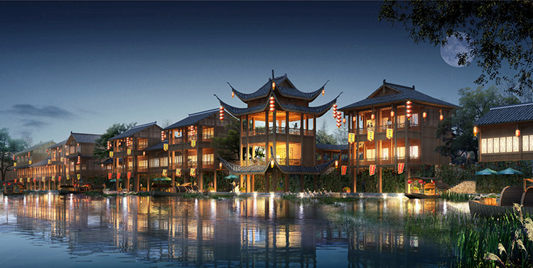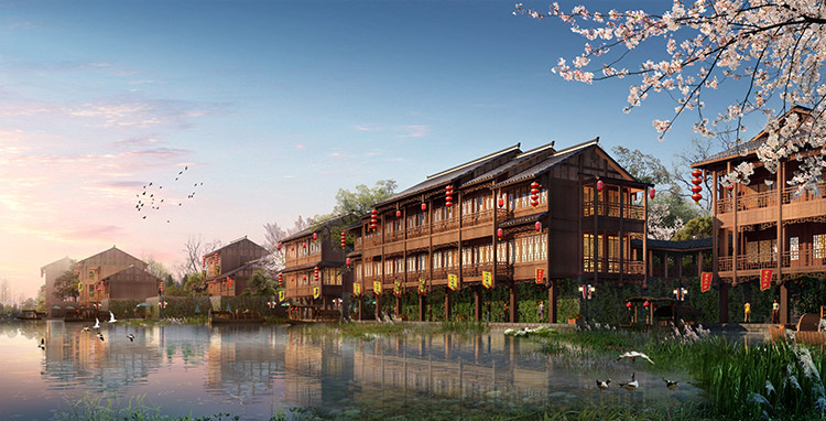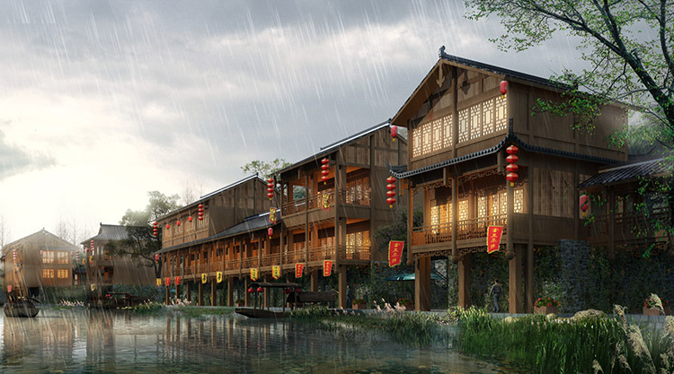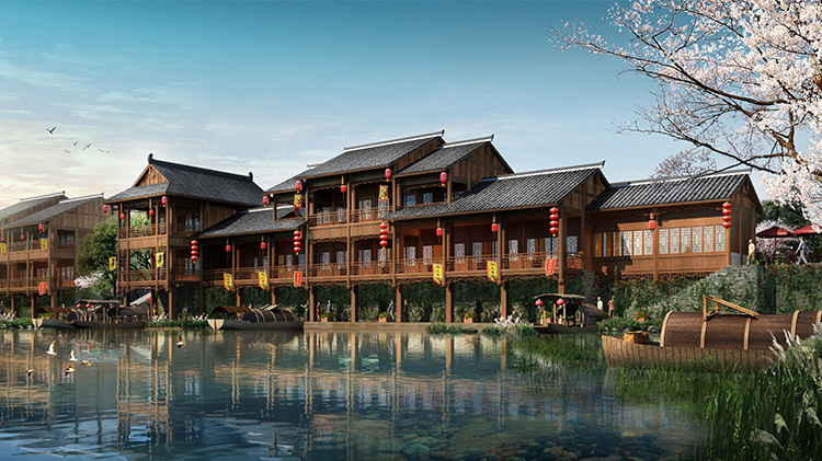 栗河吊腳樓沿河呈狹長不規(guī)則帶狀,南北向進(jìn)深約25m,東西向?qū)捈s527m。項(xiàng)目占地面積12486.41平米(18.73畝),總建筑面積4520.87平米,分為A至J十個(gè)單體建筑,建筑層數(shù)1~2層,門面商鋪45間,沿河道均勻分布。建筑依據(jù)場(chǎng)地,與南側(cè)道路平行布置,建筑主入口面向場(chǎng)地南側(cè)道路,建筑沿河布局,底部1層為架空空間,其上為主體建筑,建筑整體風(fēng)格風(fēng)貌為仿明清時(shí)代,外觀簡(jiǎn)潔、大方,給人以明朗、周正的空間體驗(yàn)。契合時(shí)代新形象,尺度更為親切。場(chǎng)地內(nèi)部景觀主要由硬質(zhì)景觀與軟質(zhì)景觀共同構(gòu)成。硬質(zhì)景觀主要包括廣場(chǎng)、步道和活動(dòng)場(chǎng)地,軟質(zhì)景觀主要是綠化種植。